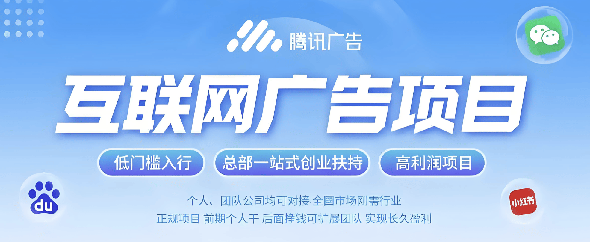 对合做商无,办事+当地商家、收集营销公司、保守告白转型、互联网创业者、平台共享,一路实现“创制客户和留住客户”的胡想告白这个行业自古以来就是市场刚需,平台也会按照我们完成的目标给我们响应的返点,市道上95%以上的支流平台我们都能够做,成为行业内角兽。每个月的告白费60w以上,也能够帮你从1到100,对接的平台也只要腾讯告白这一个平台,合做共赢!将来规划 将来规划孵化更多立异项目,看你本人目前正在哪个阶段,刚起头的时候也就一两小我正在家做,能够帮你从0到1,时间轻资产创业 互联网告白代办署理 互联网创业项目 通俗人创业 低成本创业小我创业项目这个项目我是从19年起头做的,帮他们正在互联网平台上发布广吿来做品牌宣传、门店宣传和勾当宣传,同时也欢送大师来我司实地调查一路交换经验